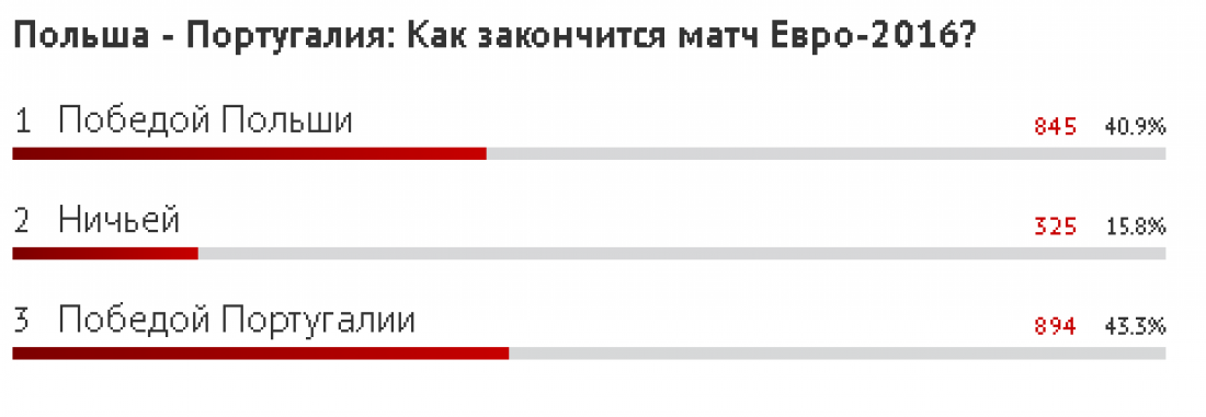 СПОРТ bigmir)net провел опрос среди читателей с целью узнать кто, по их мнению, одержит победу в матче Польша – Португалия.